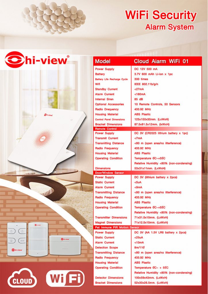 อุปกรณ์แจ้งเตือนกันขโมย Cloud Alarm wifi 01P, AlarmCurrent <180mA, Internet Siren 85dB, Optional Accessories 10 Remote Controls & 50 Sensor, Standby <27mA, Wifi IEEE802.11b/g/n, Battery life recharge cycle 300 times, Power supply DC12V 500mA