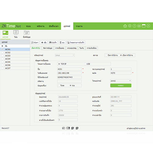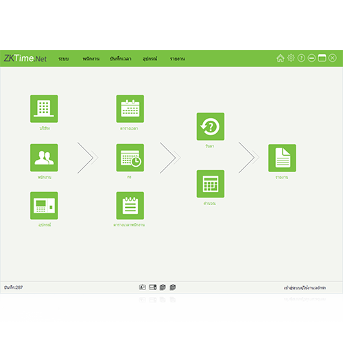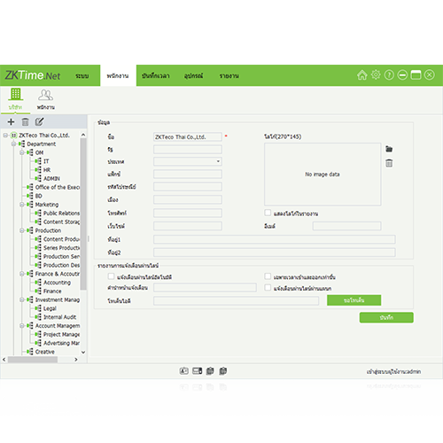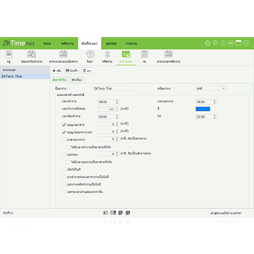 ZKTime.Net เวอร์ชั่นไทย เป็นซอฟต์แวรที่ง่ายเพื่อจัดการกับแผนกทรัพยากรบุคคลและสนับสนุนรายงานการแจ้งเตือนผ่านทาง LINE รวมถึงข้อมูลปัจจุบันและข้อมูลที่ขาด ,ลา ,มาสาย ,ออกก่อนเวลาออกจากจากข้อมูลประเภทรายงาน ฯลฯ ด้วย วิธีทำงานง่ายขึ้นและมีประสิทธิภาพมากขึ้น
